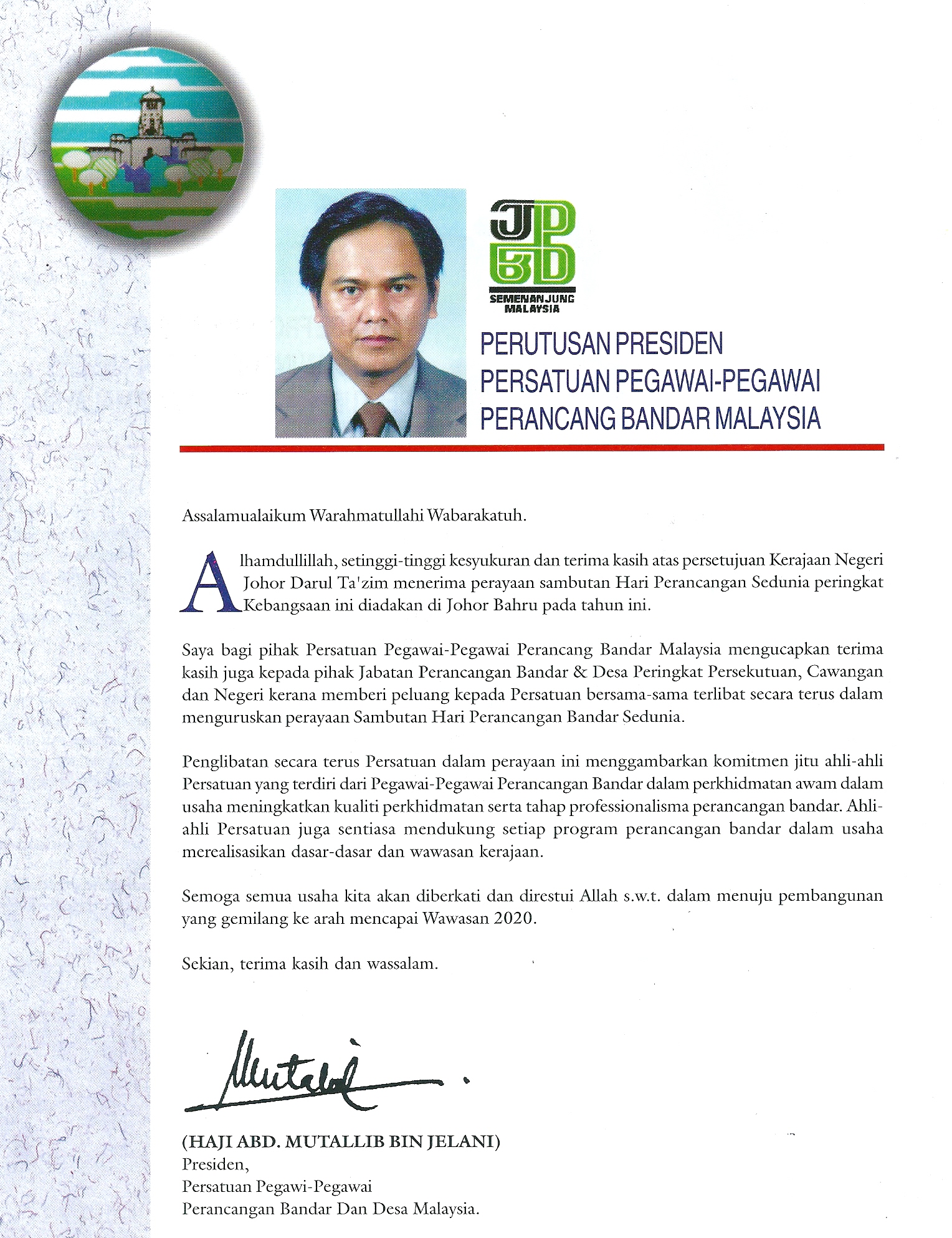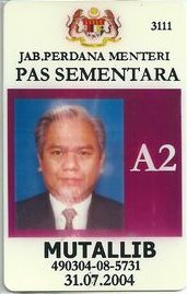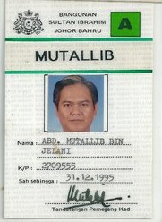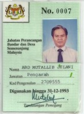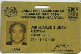 Nama: Dato' Hj. Abd. Mutallib bin Jelani No. Kad Pengenalan: 490304-08-5731 Tarikh Lahir: 4 Mac 1949. [G-3]Kelulusan-Kelulusan Akademik 1 Technical College, Kuala Lumpur. - Pembiayaan Kerajaan Negeri Perak (1967 - 1970): Diploma dalam Perancangan Bandar dan Kampung. 2 Diploma in Town and Regional Planning (Bersamaan Ijazah Sarjana Muda) University of Melbourne, Australia. - Pembiayaan Rancangan Colombo, Kerajaan Australia (1970 - 1973) [G-4]Kelulusan Profesional. 1 Ahli Fellow dan Korporat Pertubuhan Perancang Malaysia (No. 111/83) 2 Ahli Lembaga Perancang Bandar Malaysia (No. A 0084) 3 Diploma in Housing, Planning and Building, Institute of Housing Studies, Rotterdam. - Pembiayaan Kerajaan Netherlands [G-5] Ringkasan Perjawatan dalam Kerajaan. " Lantikan Pertama dalam Perkhidmatan Kerajaan: 7.2.1974 " Tarikh-Tarikh Kenaikan Pangkat. o Ke Tingkatan Kanan: 15.8.1979 o Ke Tingkatan Tertinggi 'G": 15.8.1981 o Ke Tingkatan Tertinggi 'F': 1.11.1990 o Petukaran Sementara ke Perkhidmatan Arkitek Landskap, Tingkatan Tertinggi 'F": 15.1.1991 hingga 1.9.1992 o Ke Gred J1: 15.11.1995 o Ke Gred Utama 'C' (JUSA): 15.6.2001 o Ke Gred Utama 'B' (JUSA) 6.6.2003 |